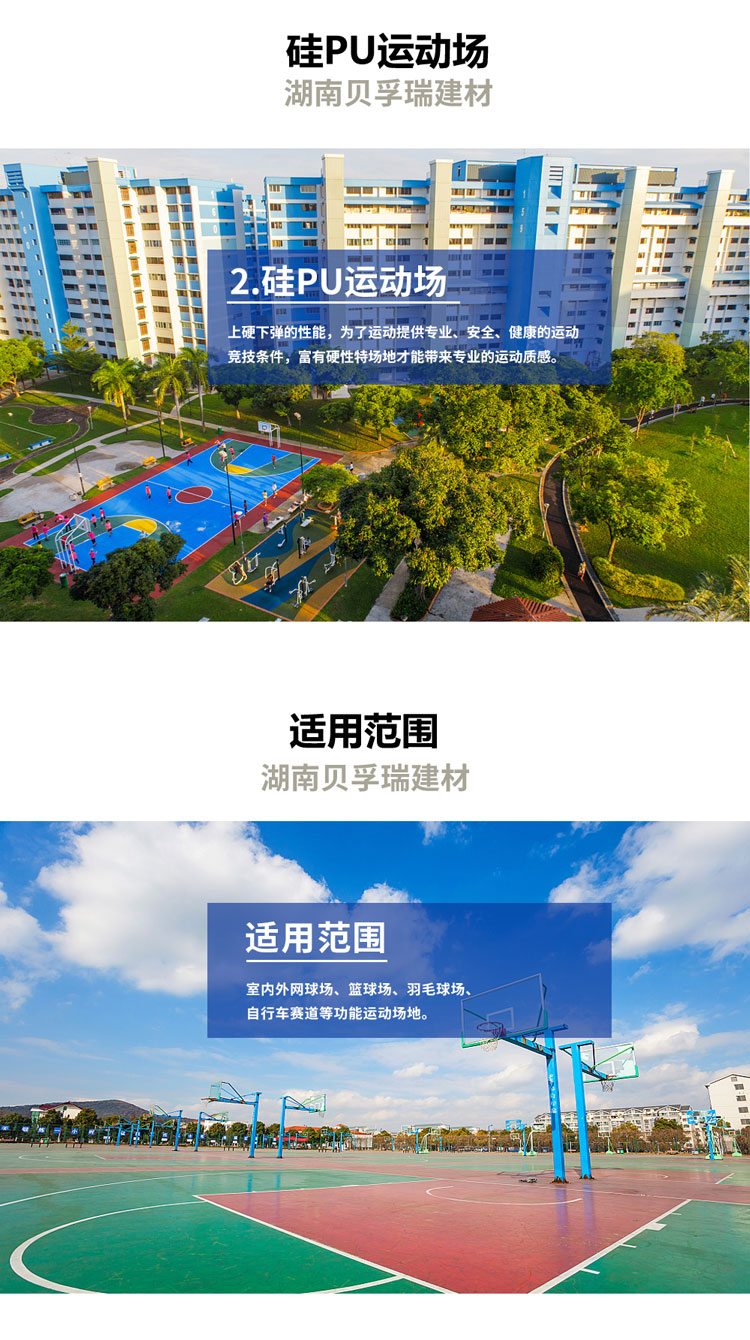 、超強的耐磨性:硅PU面層采用添加硅樹脂顆粒做法,其結構特征恒久穩定不變,軟硬適中,耐磨性能滿足長期高使用頻率的需要。
